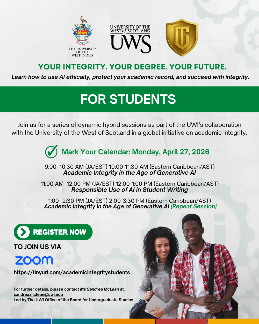 Learn how to use AI ethically, protect your academic record, and succeed with integrity. Join a series of dynamic hybrid sessions as part of The UWI’s collaboration