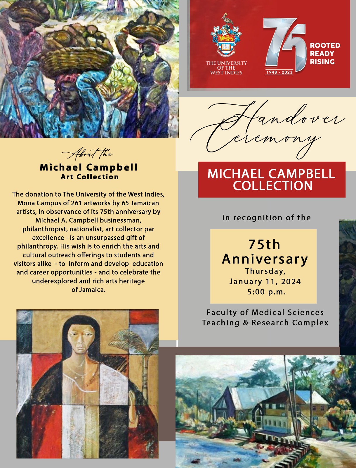 The donation to The University of the West Indies, Mona Campus of 261 Artworks by 65 Jamaican artists, in observance of its 75th anniversary by Michael Campbell is an unsurpassed gift of philanthropy. His wish is to enrich the arts and cultural outreach offerings to students and visitors alike.