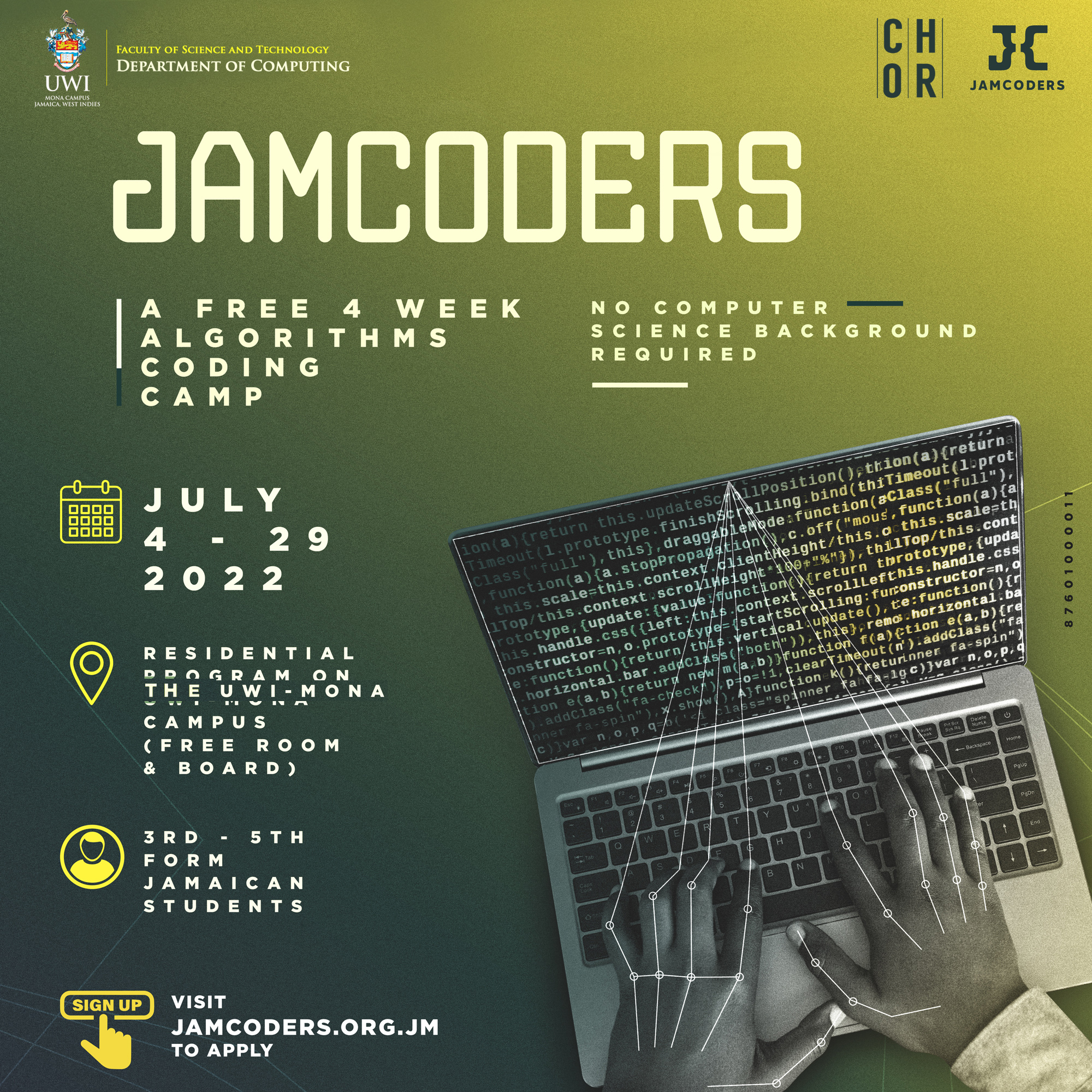 JamCoders is being organized by the Department of Computing (DoC), Faculty of Science & Technology (FST) at The UWI, Mona, members of the Caribbean Diaspora working at Google and UC Berkeley, and the Reggae Artiste, Chronixx through his CHOR Foundation. The programme is similar to AddisCoder, a programme Professor Jelani Nelson of UC Berkeley founded in Ethiopia, which is now co-organized by the Meles Zenawi Foundation and supported by the Ethiopian government.