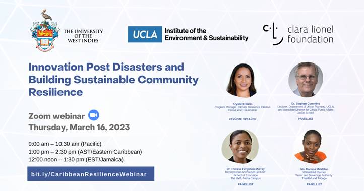 The University of the West Indies through the Office of Global Affairs, together with the Institute of the Environment and Sustainability at UCLA and the Clara Lionel Foundation will host a webinar themed, Innovation Post Disasters and Building Sustainable Community Resilience.