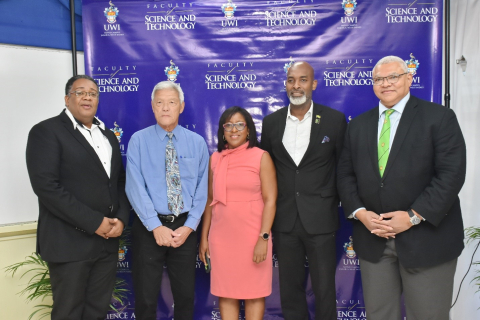 (L-R) Professor Michael Taylor, Dean of the Faculty of Science and Technology (FST); Mr Robert Chan, son of the Wilfred Chan (Wilfred Chan Endowment Fund); Mrs Elecia Myers, Resource Mobilization Coordinator, FST; Mr Ainsley Henry, President of the FST Alumni Association; and keynote speaker Professor John-Paul Clarke, Professor of Aerospace Engineering and Engineering Mechanics, University of Texas at Austin all pictured at the Morning Mixer and Launch of the Faculty’s Endowment Fund hosted on Wednesday, December 6, 2023