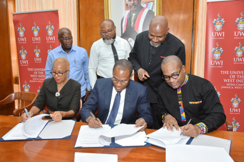 From right to left: Professor Densil A. Williams, Principal and Pro Vice-Chancellor of The UWI, Mona; The Honourable Dr. Nigel Clarke, Minister of Finance and the Public Service; and The Honourable Mrs. Fayval Williams, Minister of Education and Youth; officially sign The UWI Mona’s Interim Wage Agreement during the recent Wage Negotiations Signing Ceremony on April 25. Standing behind them (from left to right) are union representatives Clifton Grant, President of the University and Allied Workers Union; Jeffery Thompson, President of the Mona Administrative and Technical Staff Association; and Professor Paul Brown, President of the West Indies Group of University Teachers.