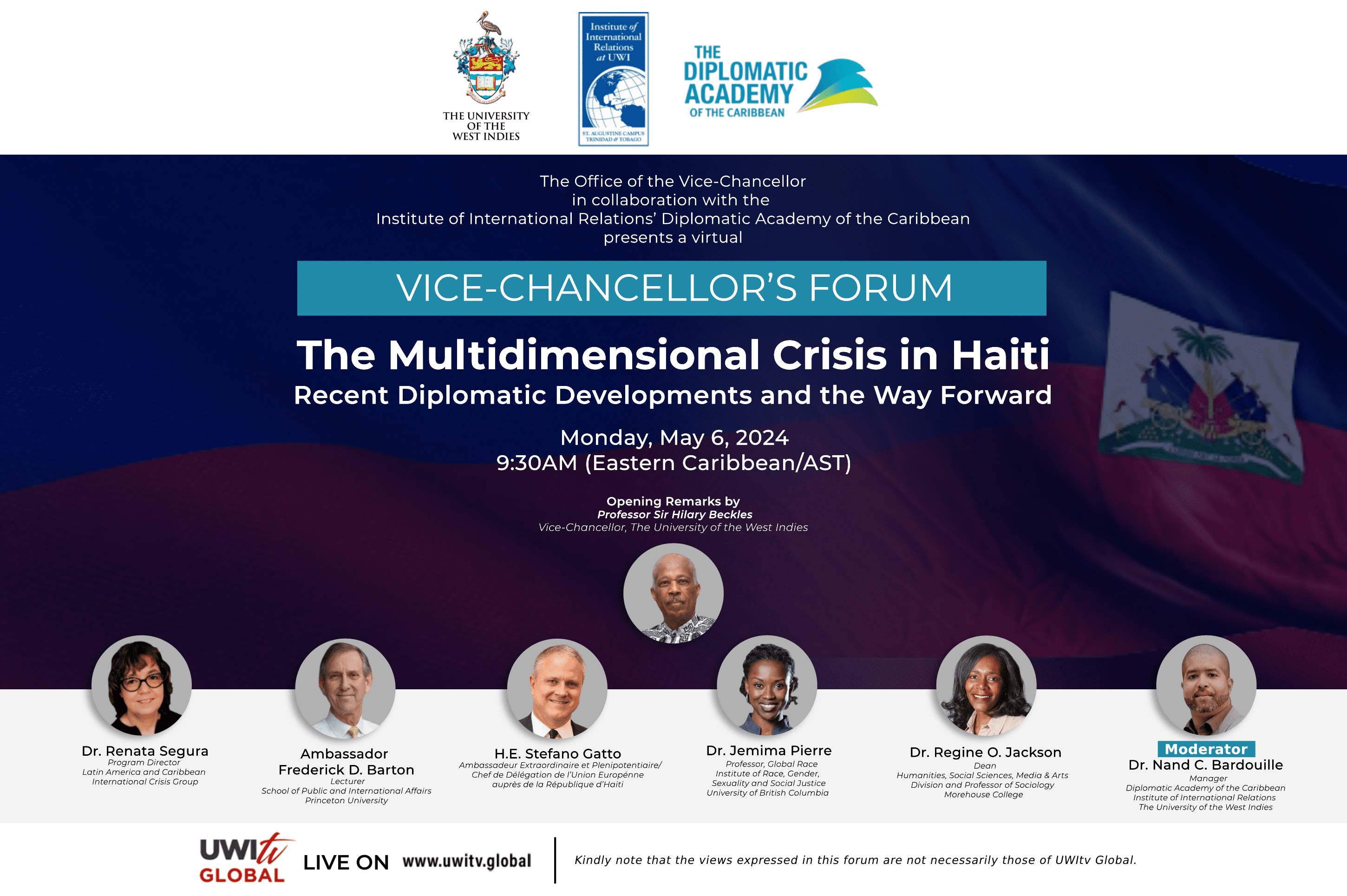 On Monday, May 6, The University of the West Indies, Office of the Vice-Chancellor in collaboration with the Institute of International Relations’ Diplomatic Academy of the Caribbean, will host a virtual Vice-Chancellor’s Forum themed, The Multidimensional Crisis in Haiti: Recent Diplomatic Developments and the Way Forward.